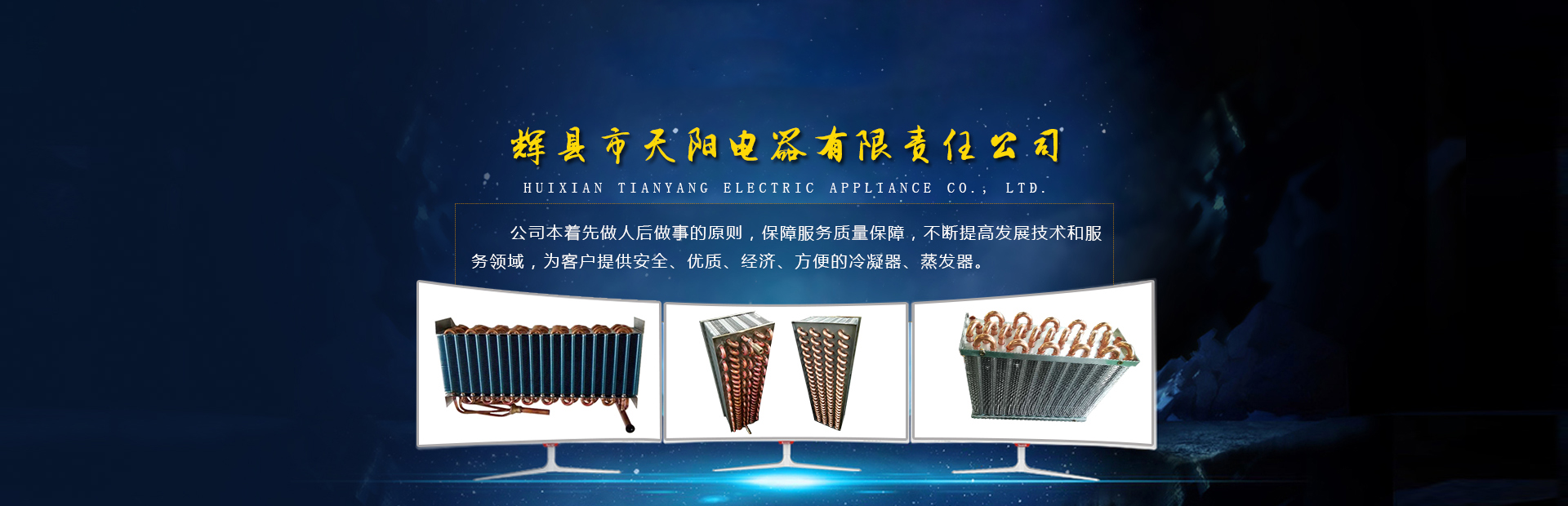 輝縣天陽電器有限責任公司位于肥沃的中原河南省輝縣市學院路中段工業集聚區興業園3號廠房,以制冷設備用冷凝器,蒸發器,熱交換器為主。主要材料為銅管鋁翅片,銅管銅翅片,鋁管鋁翅片。廣泛應用于冰箱冰柜,制冷設備,暖通設備,空調,自動售貨機,冷干機,超市立風柜,冷藏車,烘干機等產品領域。  公司自1998年成立以來,始終堅持:“科技造就產業、質量成就信譽、誠信鑄就輝煌”的質量方針,從產品拓展上堅持“人無我有,人有我優,人優我特的”經營理念,25年來,從1998年開始供應河南冰熊集團下屬的冷柜廠,制冰機廠各種冷凝器;2003年之后,原冰熊集團的精英志士開始在全國各地發展,所到之處依托我公司供貨,以致于多家目前已具行業中佼佼者的公司,從而建立了如凱雪公司,兆邦公司、凌云公司、海寶公司、正雪公司、上海忠云、山東德萊維等幾十余家公司在草創時期的啟蒙供貨商,友好共贏長達十余年,成為我國制冷行業的供應商。以致在2015年初雙匯集團面向社會的招標書中指名要我公司冷凝器、蒸發器指定產品供應商